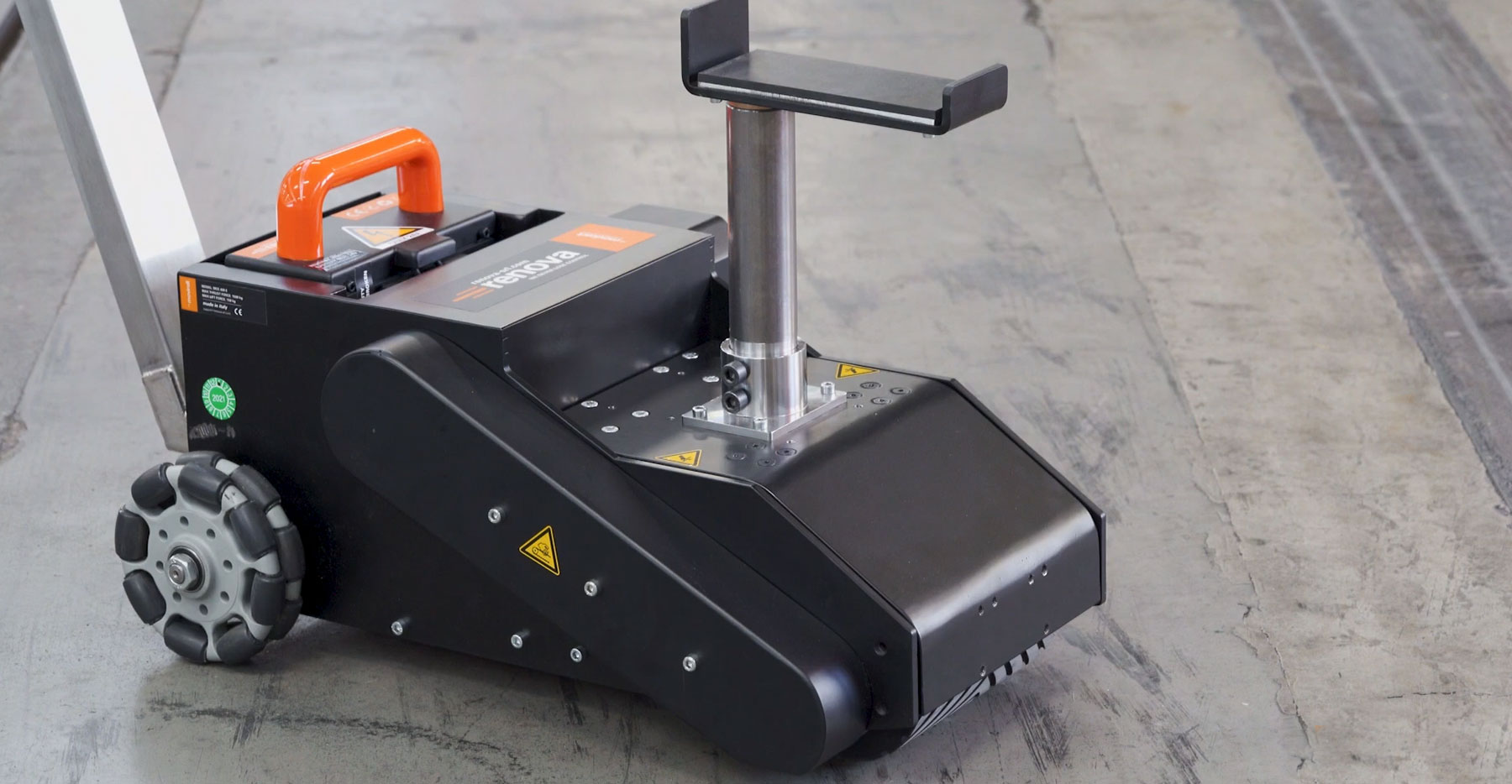 Handy and heavy-duty, it is able to move carts up to 5 tons (11000 lb). It is a convenient alternative to forklifts or transpallets as it can be used without a license and can operate in narrow spaces and where forklifts are not allowed.